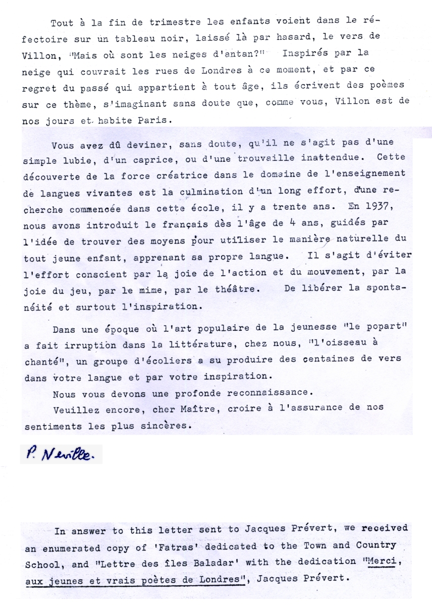 The poems, Mr. Neville's letter and a note about Jaques Prévert's reply are