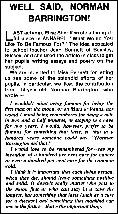 Mini-Essay, sent to Annabel Magazine by Jean Bennet - Norman Barrington 1966